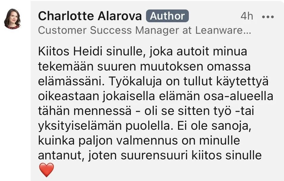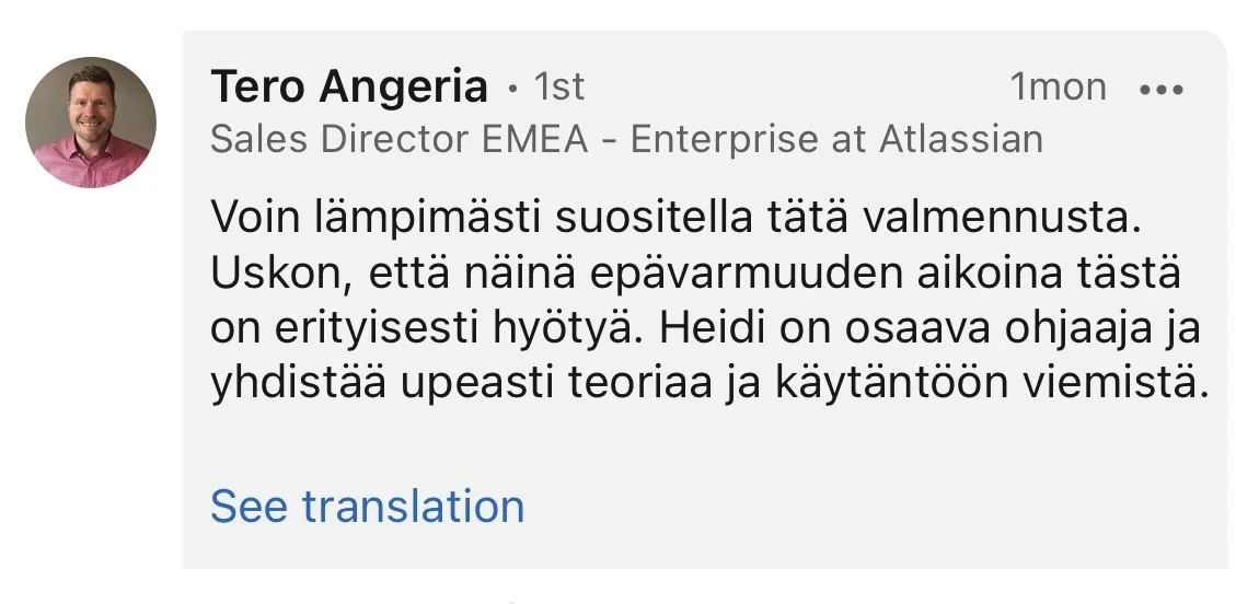 Suosittelen Heidin valmennusta kaikille, jotka haluavat kehittää johtamis- ja ihmissuhdetaitojaan.