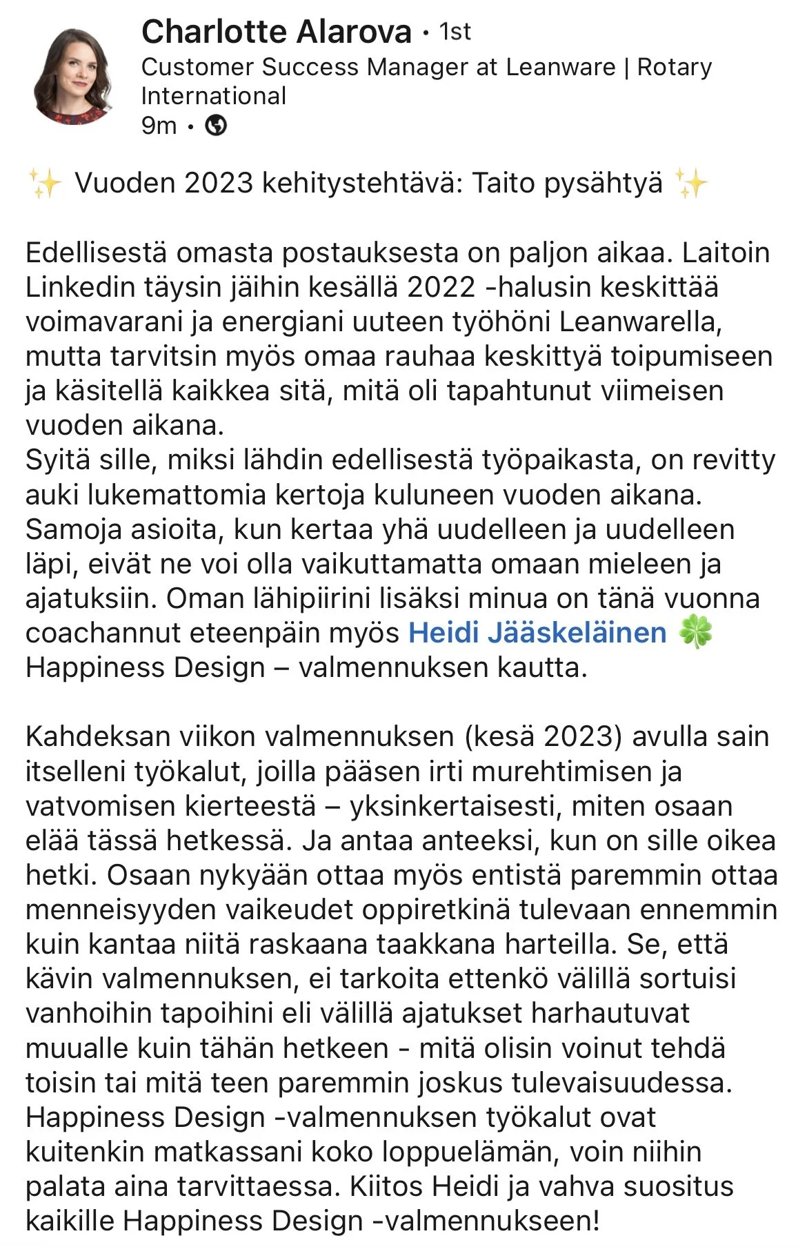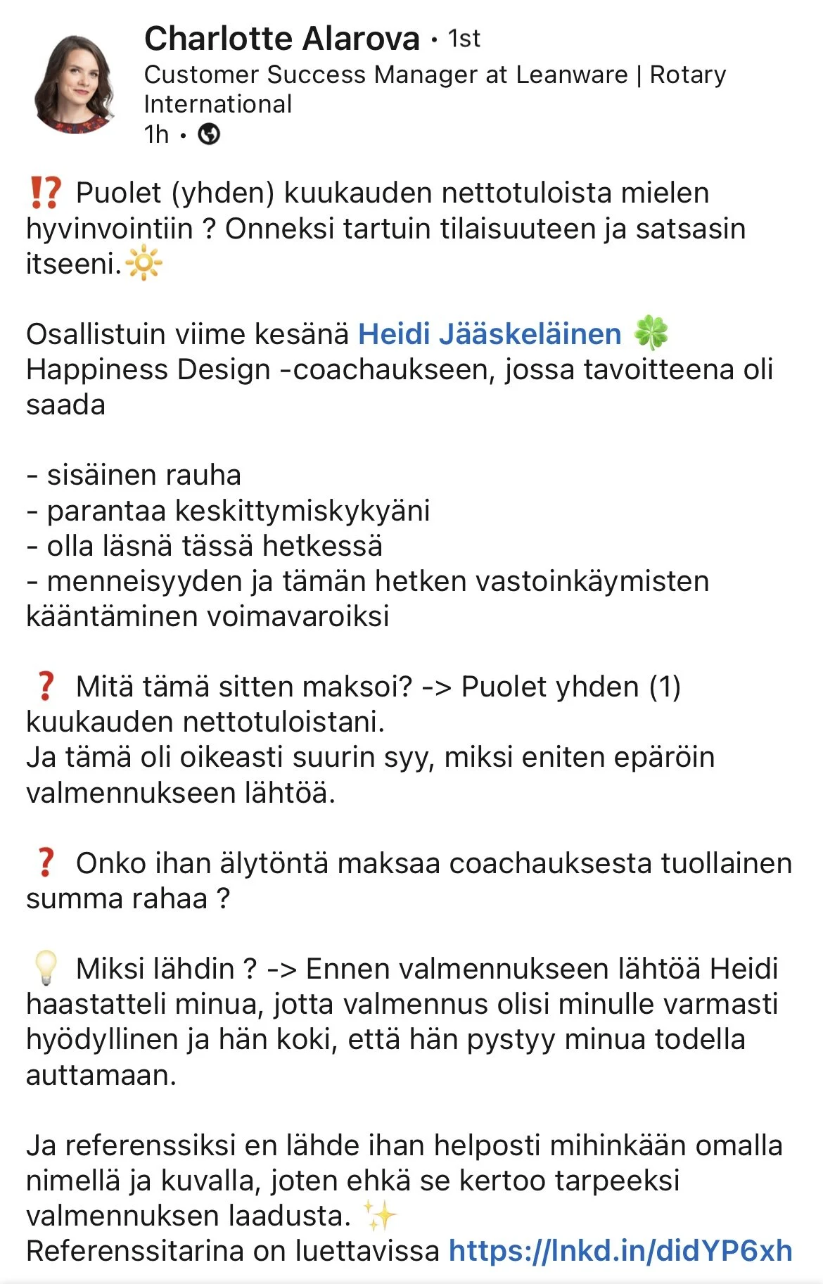 Palaute saatu 3.3.2023 LinkedInissä. -