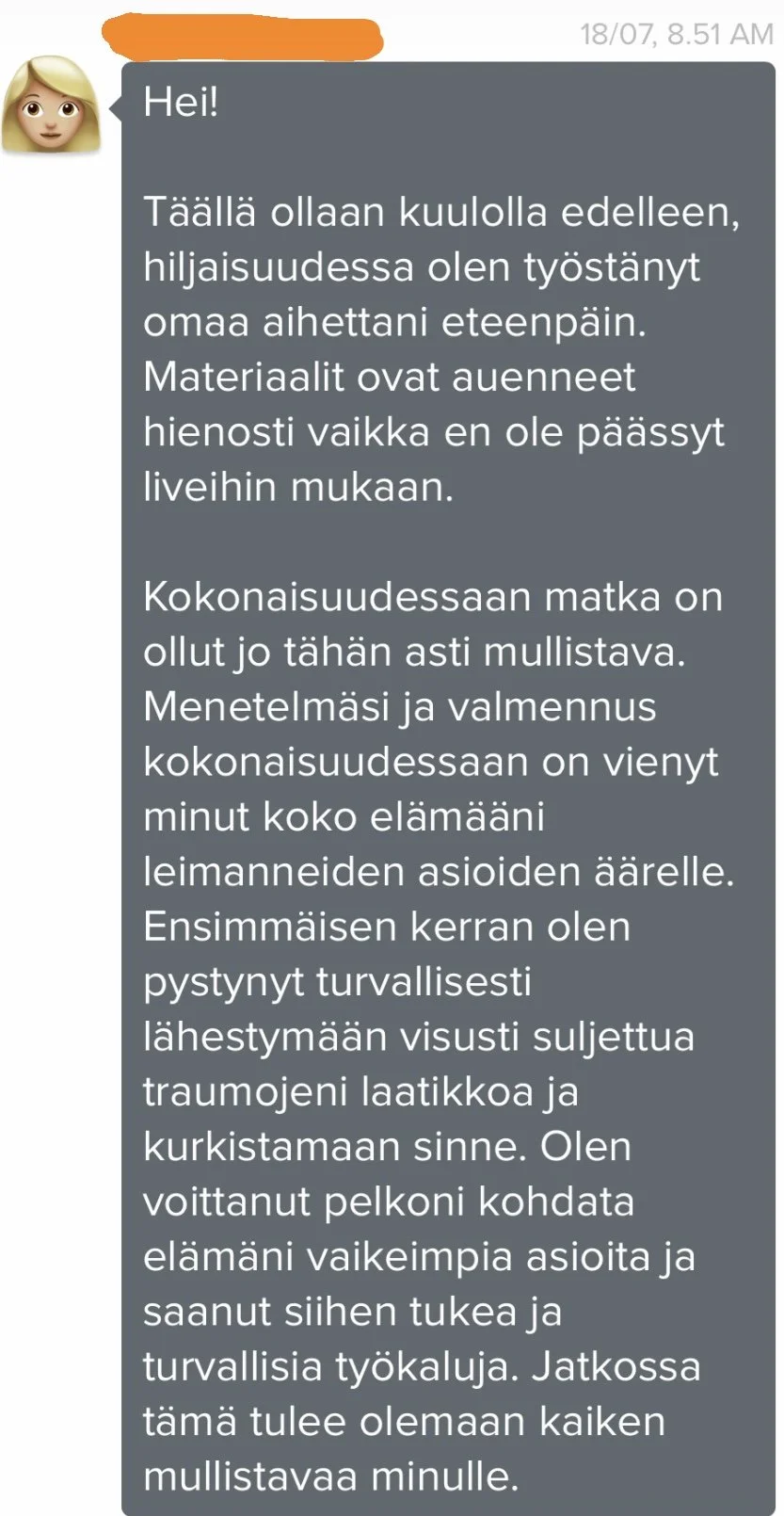 Asiakkaan viesti valmennuksen aikana, v. 2023.