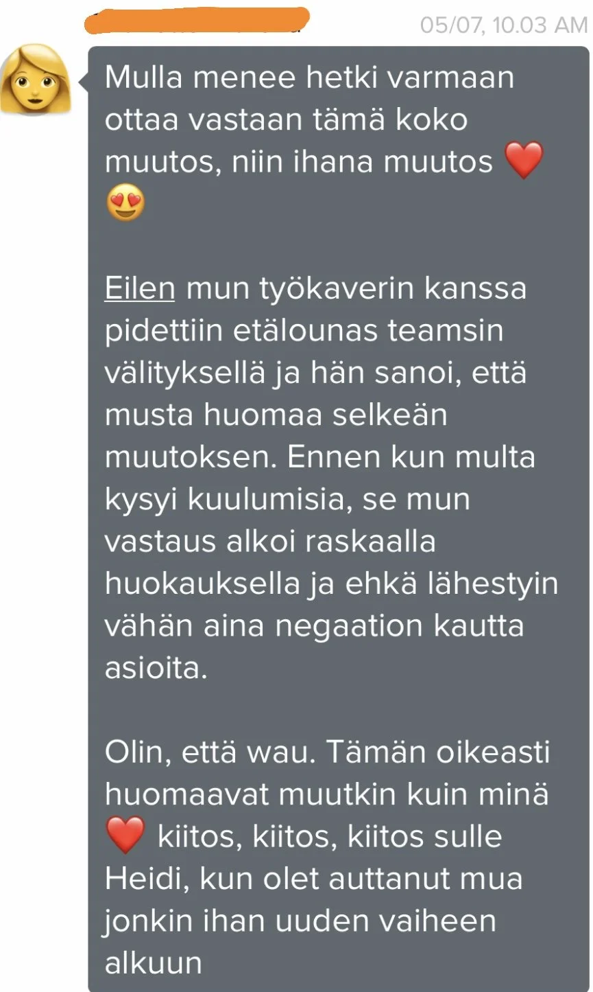 Heidi on kasannut konkreettiset työkalut ja ohjeet siihen, mitä tehdä negatiivisen ajatuskierteen hetkellä. Ajatteluni on muuttunut positiivisemmaksi ja elämiseen tässä hetkessä. Osaan pysähtyä kun ajatukset lähtevät pyörimään samaa rataa.